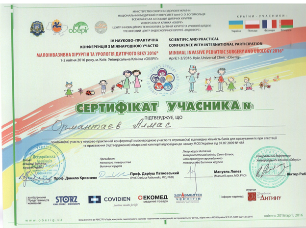 - «Бала жасына байланысты эндоскопиялық урология» бойынша өткізілген мастер-класс – д.м.н., проф. руководитель отделения урологии Зорькин С.Н. «Федеральное государственное бюджетное учреждение. Научный центр здоровья детей Российской академии наук. КазНМУ, кафедра детской хирургии, Алматинская региональная детская клиническая больница, 2013 г.