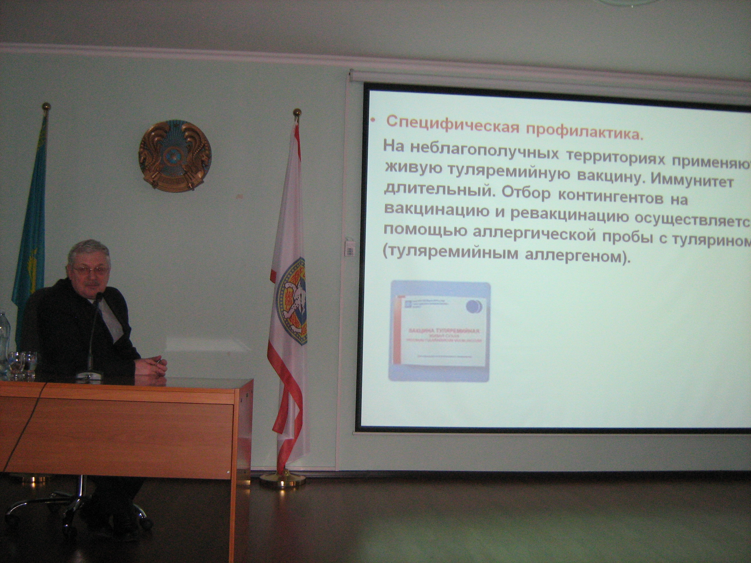 PhD Туребеков Н.А. «Актуальные проблемы эпидемиологии, микробиологии, природной очаговости болезней человека» ғылыми тәжірибелік конференциясында баяндама жасауда, Ресей, Омск