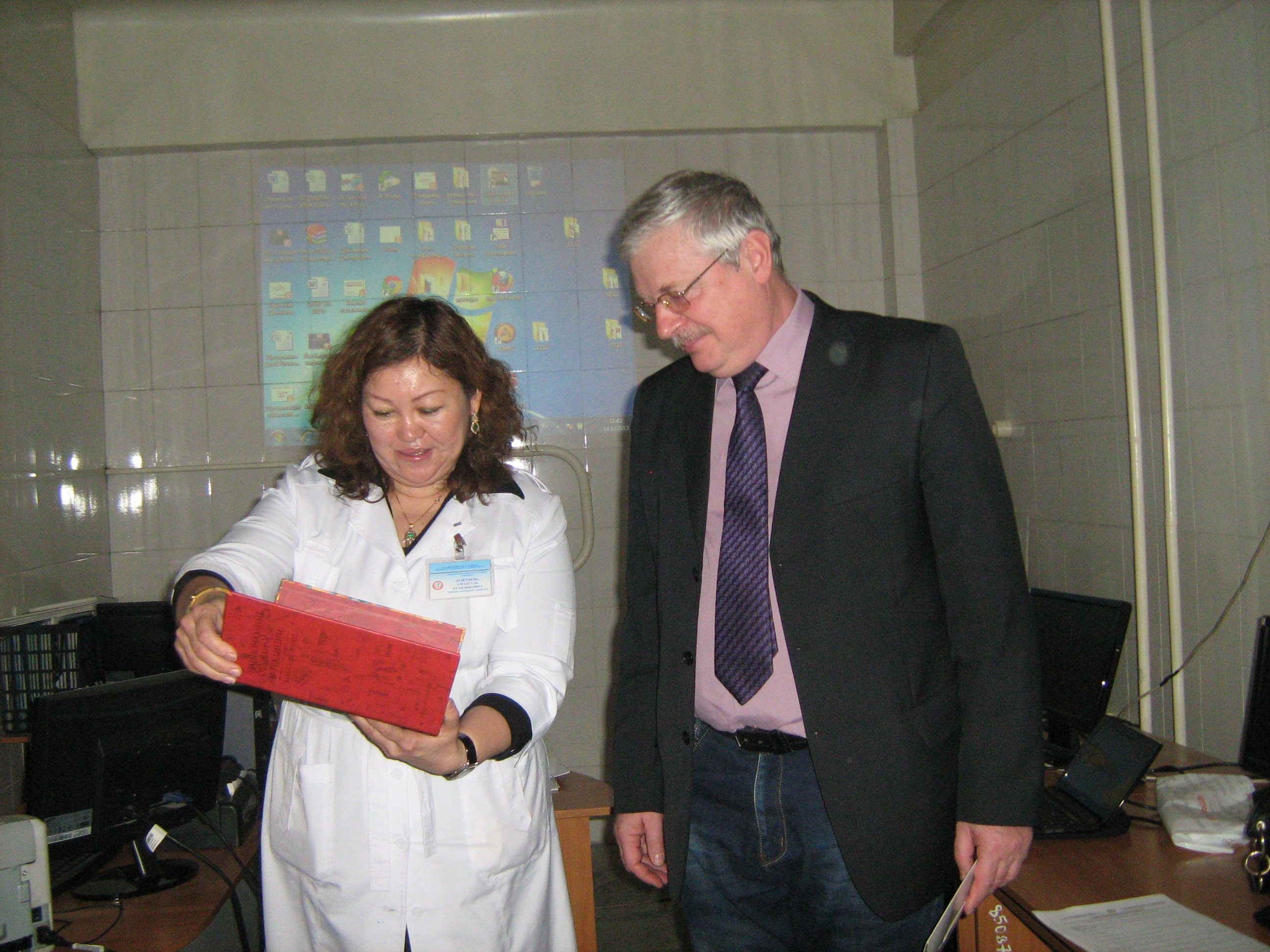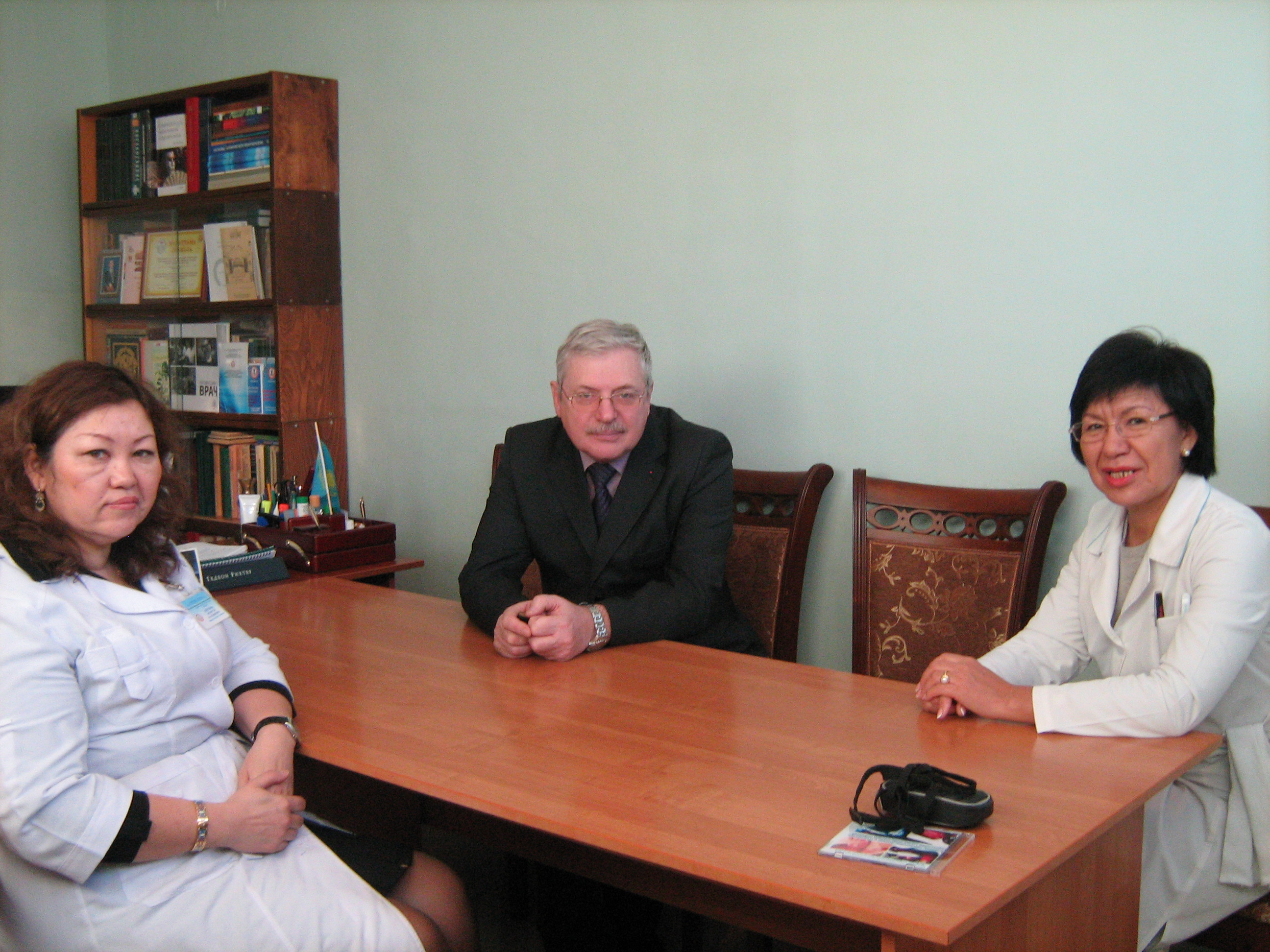 Проф. Рудаков Н.В. ҚазҰМУ жұқпалы және тропикалық арулар кафедрасының меңгерушісі проф. Дүйсенова А.К. және ҚазҮБСУ жұқпалы аурулар кафедрасының меңгерушісі проф. Доскожаева С.Т. кездесуі (желтоқсан, 2013ж.)