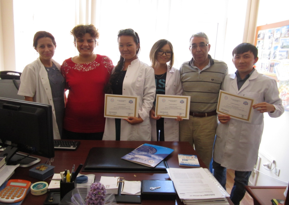 С.Д.Асфендияров атындағы ҚазҰМУ жұқпалы және тропикалық аурулар кафедрасының резиденттеріне сертификаттарды табыстау (солдан оңға қарай – доцент Ayşeğul Ulu Kılıç,