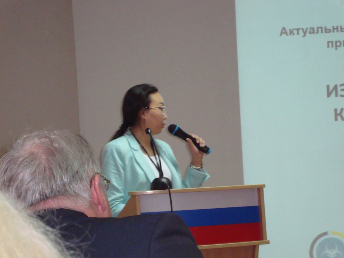 PhD Абдиева К.С. «Актуальные проблемы эпидемиологии, микробиологии, природной очаговости болезней человека» ғылыми тәжірибелік конференциясында баяндама жасауда, Ресей, Омск,15-16.2016.