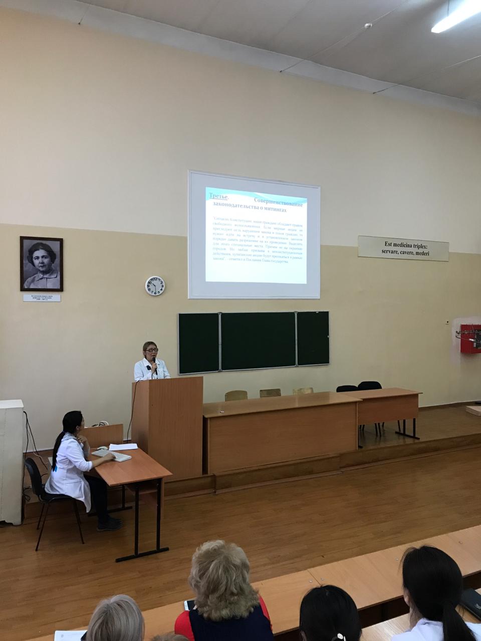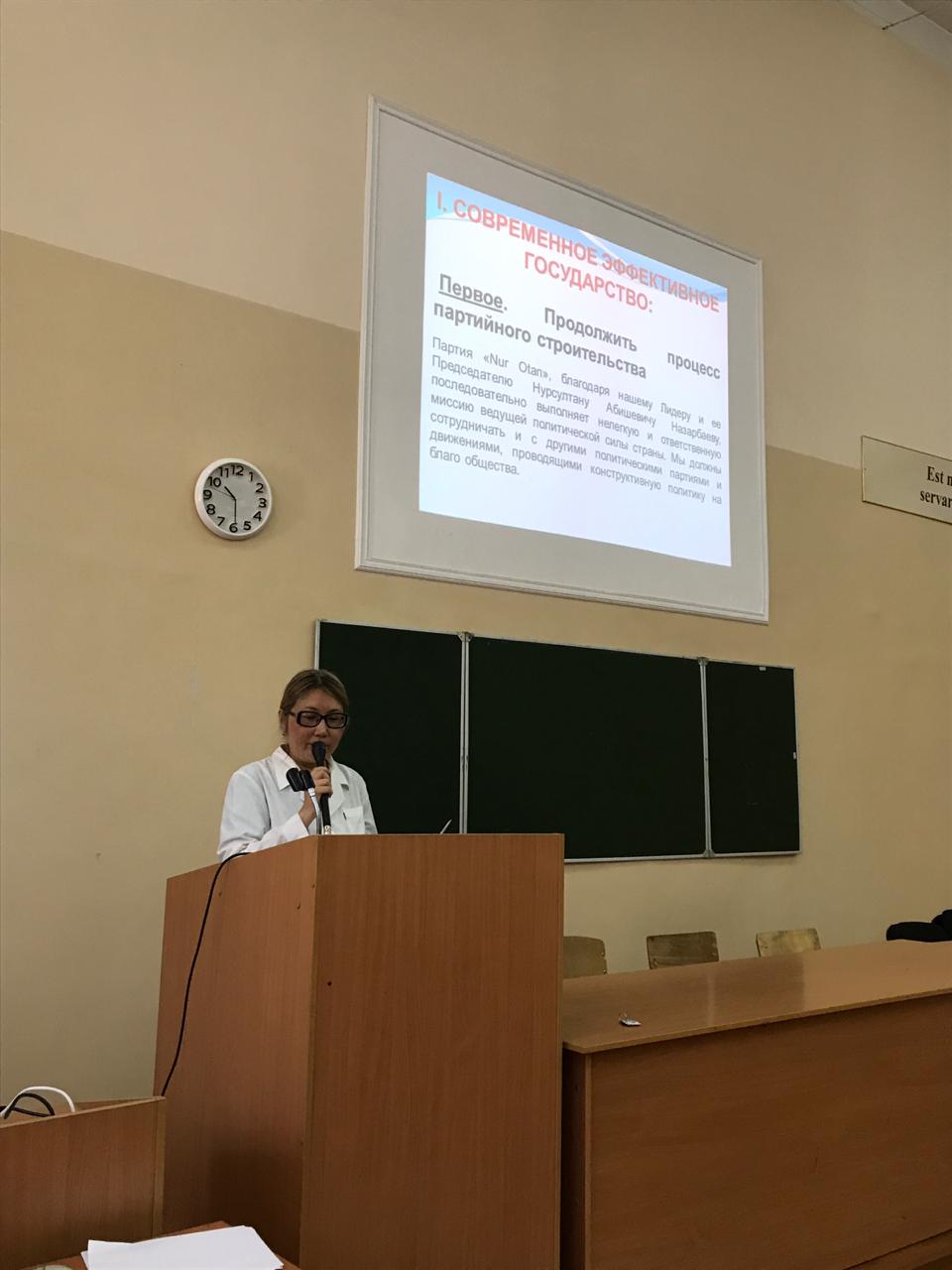 Лектор кафедры нормальной физиологии Алипбекова А.С. отметила в своем выступлении основные положения Послания Президента. В ходе обсуждения Послания Президента участники встречи выразили одобрение по поводу создания представительного по составу Национального Совета общественного доверия, который будет работать по ротационному принципу. Так как студенческая молодежь отличается активной гражданской позицией, для нее необходимо вовлечение в обсуждение наиболее актуальных общегосударственных задач. Президент предложил алгоритм выполнения этих задач, но достичь их можно только при консолидации профессорско-преподавательского состава и обучающейся молодежи.