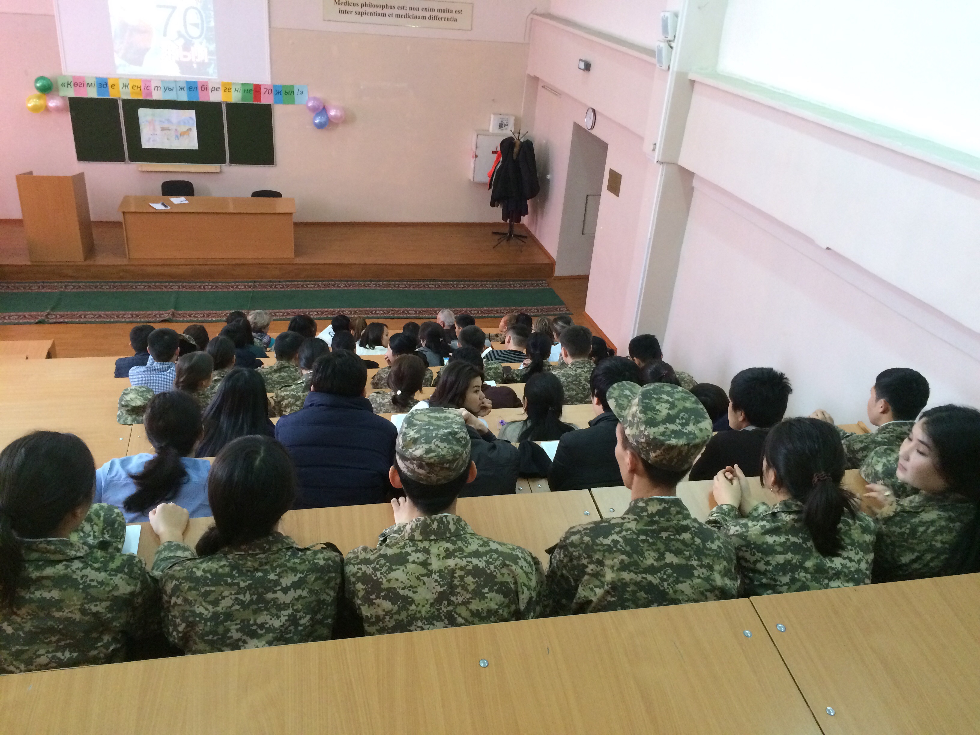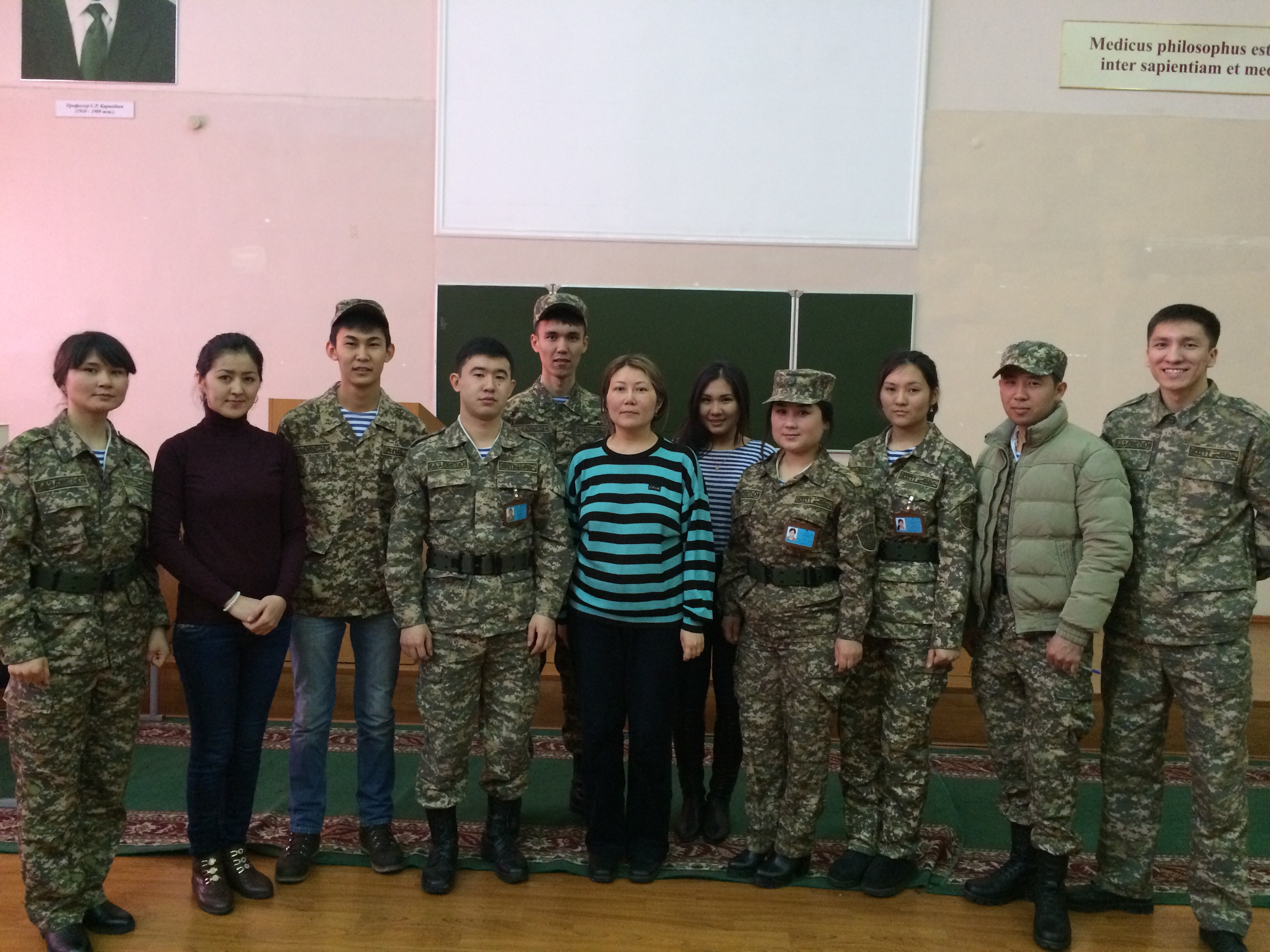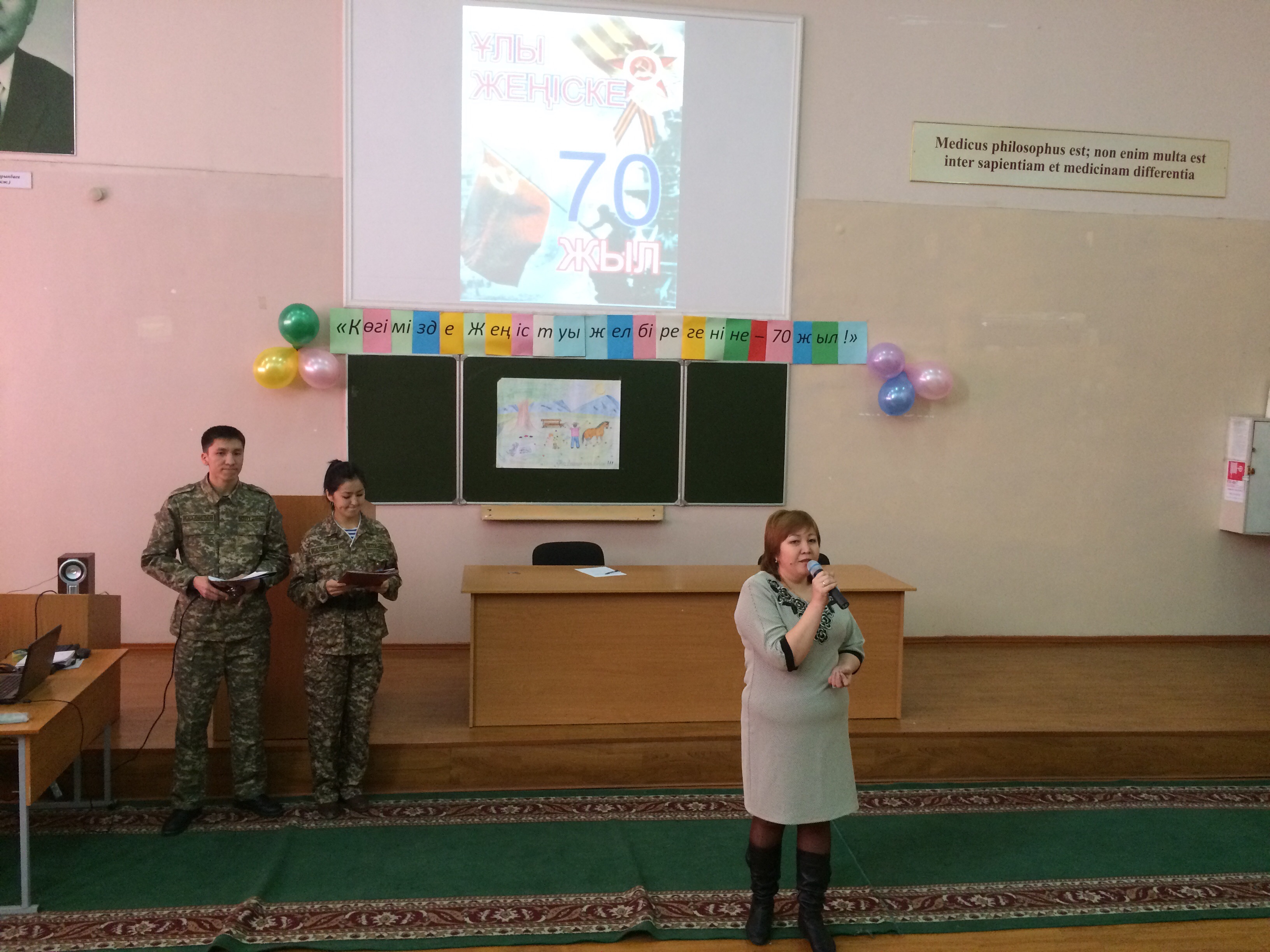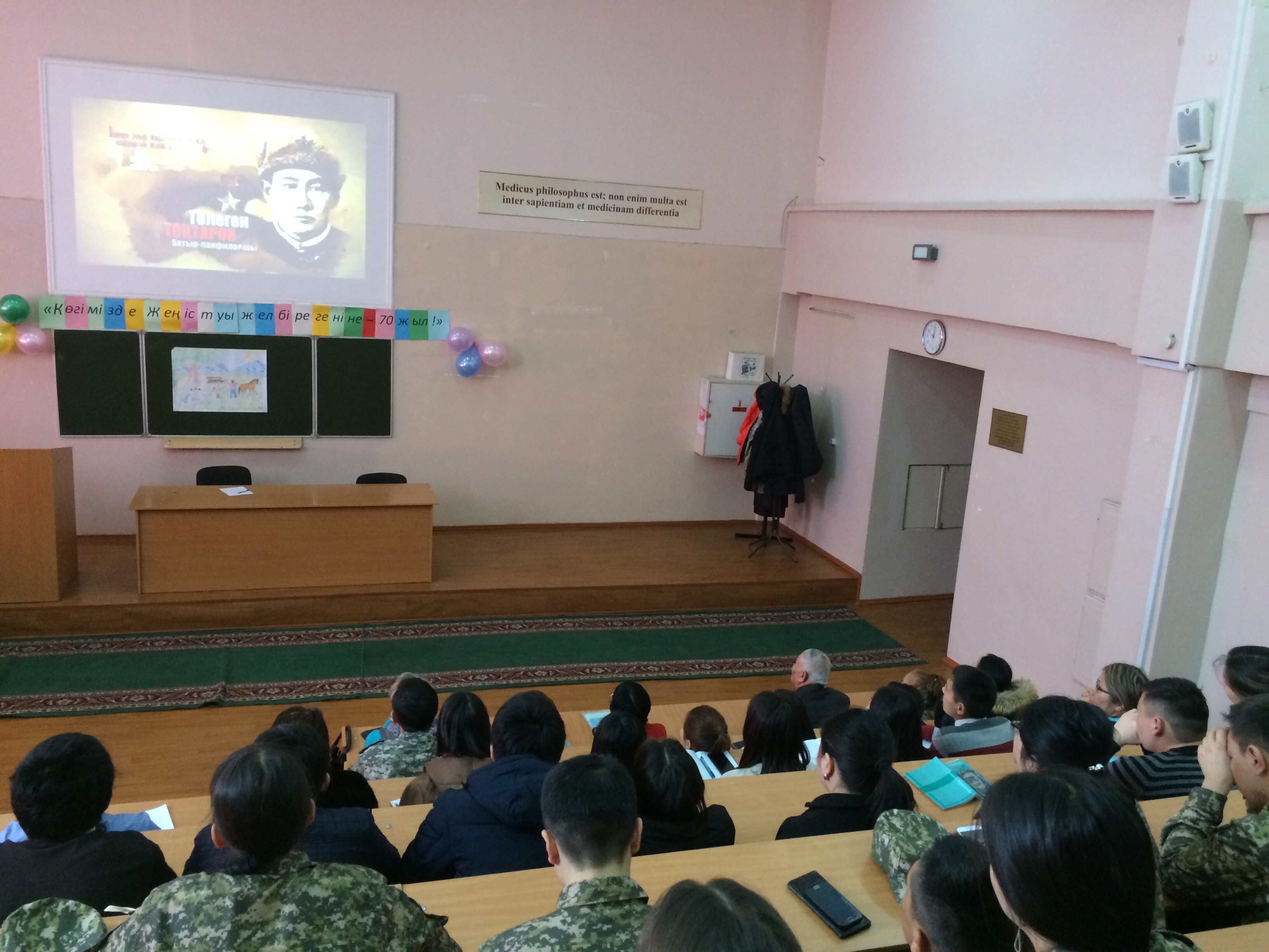 31 марта 2015 года студентами 12-027-01 группы III курса факультета «Общая медицина» под руководством ППС модуля нормальной физиологии для 100 студентов III курса факультета «Общая медицина» был организован и проведен вечер, посвященный 70-летию Славной Победы в Великой Отечественной Войне 1941-1945 гг. в аудитории №4 с приглашением проректора по учебно-воспитательной работе К.А.Тулебаева, директора департамента по развитию социально-культурных компетенций студентов Л.С.Шынгысбаева, начальника управления по социально-воспитательной работе М.Т.Султановой, директора департамента «Базовых дисциплин» К.К.Мустафиной, директора центра интегрированного обучения Г.М.Есенжановой, начальника ОП и КУП (учебная часть) К.Е.Куангалиевой, декана факультета «Общая медицина» Р.Т.Джумашевой, сотрудников деканата факультета «Общая медицина»: заместителя декана по воспитательной работе Ж.Ж.Курмангалиевой, заместителя декана 3 курса К.Т.Кашагановой, руководителя модуля гистологии Н.М.Тусуповой, старшего преподавателя военной кафедры, подполковника медицинской службы А.Т.Лесбаева. Ответственные за мероприятие и студенты 12-027-01 группы III курса факультета «Общая медицина» расширили  знания студентов о военной истории; о трудностях боевого времени, развитие духовно–нравственного, эстетического воспитания, формирование  представлений о Великой Отечественной Войне, о значении Курской битвы в Великой Отечественной войне, развитие  памяти, речи, художественного, музыкального  вкуса студентов, воспитание чувства патриотизма, гордости за свою страну, ответственности за свою Родину, воспитание чувства прекрасного, что и явилось целью проведенного вечера.