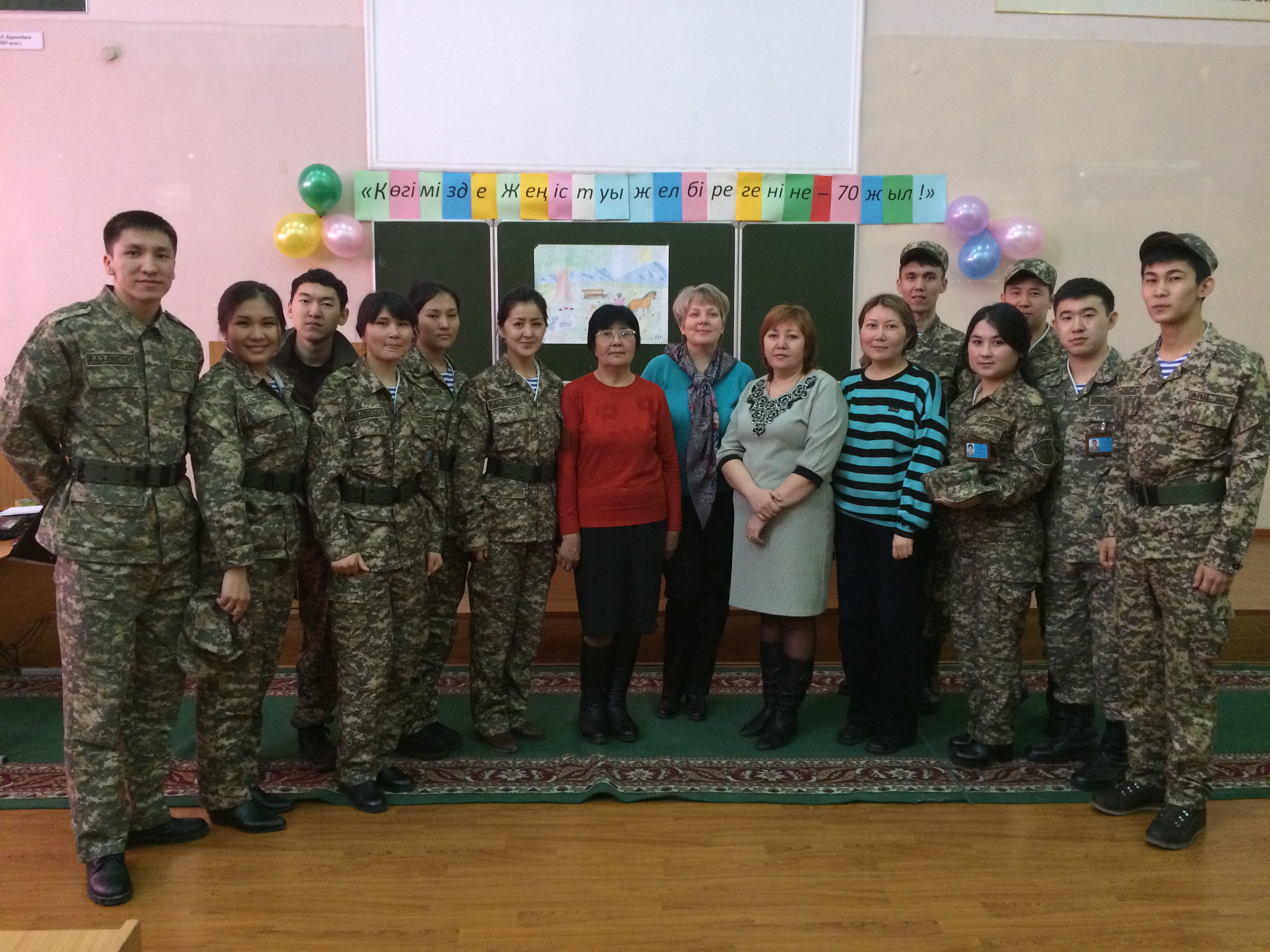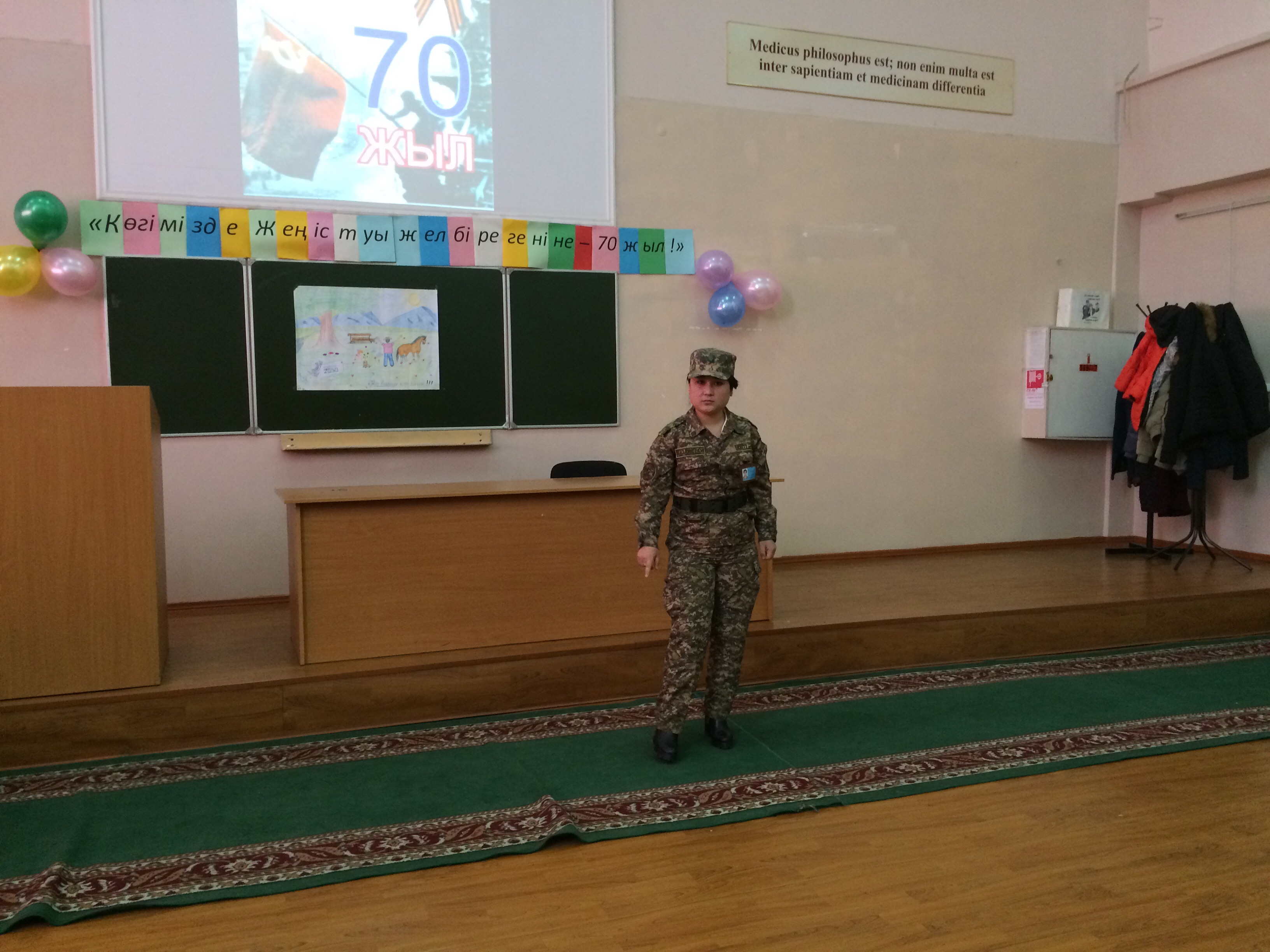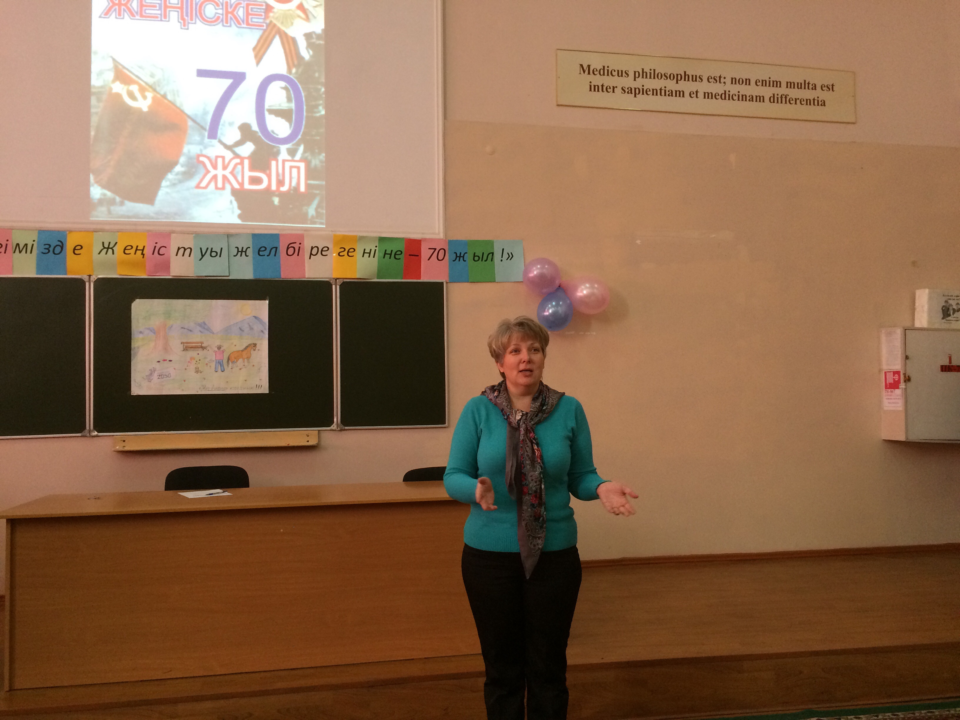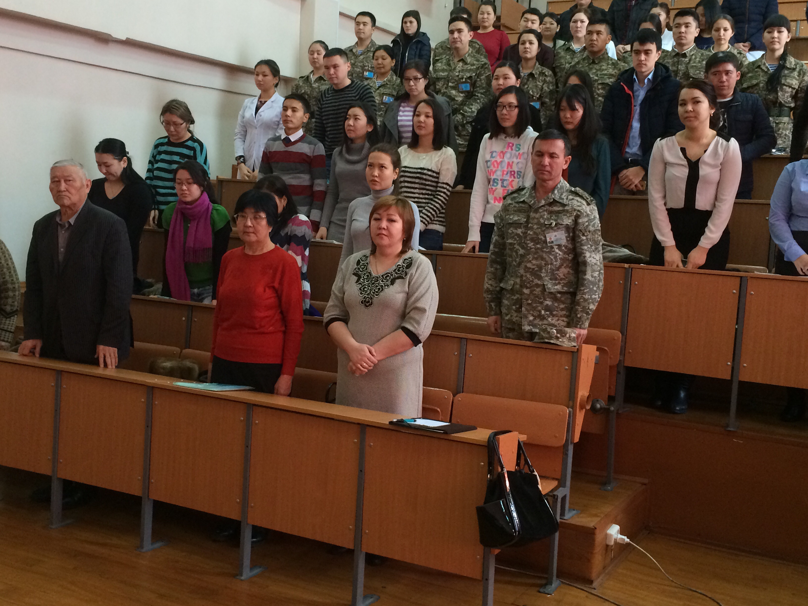 31 марта 2015 года студентами 12-027-01 группы III курса факультета «Общая медицина» под руководством ППС модуля нормальной физиологии для 100 студентов III курса факультета «Общая медицина» был организован и проведен вечер, посвященный 70-летию Славной Победы в Великой Отечественной Войне 1941-1945 гг. в аудитории №4 с приглашением проректора по учебно-воспитательной работе К.А.Тулебаева, директора департамента по развитию социально-культурных компетенций студентов Л.С.Шынгысбаева, начальника управления по социально-воспитательной работе М.Т.Султановой, директора департамента «Базовых дисциплин» К.К.Мустафиной, директора центра интегрированного обучения Г.М.Есенжановой, начальника ОП и КУП (учебная часть) К.Е.Куангалиевой, декана факультета «Общая медицина» Р.Т.Джумашевой, сотрудников деканата факультета «Общая медицина»: заместителя декана по воспитательной работе Ж.Ж.Курмангалиевой, заместителя декана 3 курса К.Т.Кашагановой, руководителя модуля гистологии Н.М.Тусуповой, старшего преподавателя военной кафедры, подполковника медицинской службы А.Т.Лесбаева. Ответственные за мероприятие и студенты 12-027-01 группы III курса факультета «Общая медицина» расширили  знания студентов о военной истории; о трудностях боевого времени, развитие духовно–нравственного, эстетического воспитания, формирование  представлений о Великой Отечественной Войне, о значении Курской битвы в Великой Отечественной войне, развитие  памяти, речи, художественного, музыкального  вкуса студентов, воспитание чувства патриотизма, гордости за свою страну, ответственности за свою Родину, воспитание чувства прекрасного, что и явилось целью проведенного вечера.