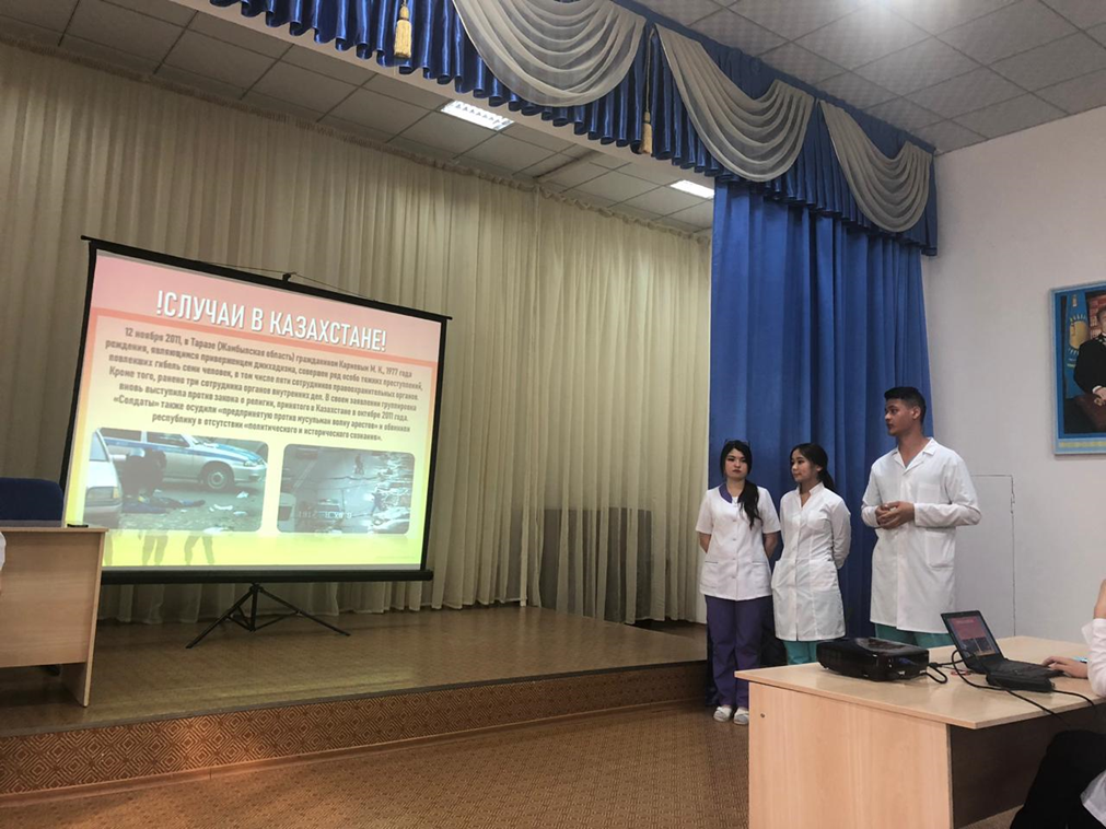 21 октября 2019 года кафедра детских инфекционных болезней на базе ДГИКБ провела мероприятие (на трех языках) «Профилактика религиозного экстремизма и терроризма на современном этапе» среди студентов факультета Общей медицины 4-го курса группы 010-1,2 (каз.), 013-1,2 (каз.), 012-1,2 (каз), 30-1,2 (рус),040-1,2(англ),7-го курса педиатрия группы 05-1,2 (каз), 08-1,2 (каз), ИБ-01,02, 03(резиденты 2год).