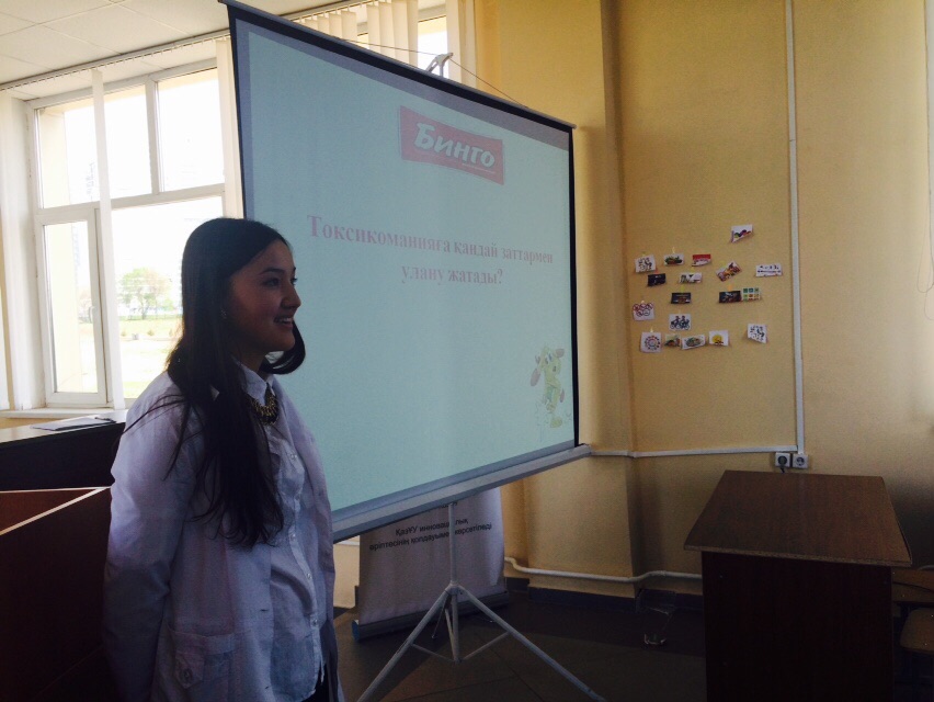 2015 жылы 22-сәуір күні психиатрия, психотерапия және наркология оқытушылары, ЖМ факультетінің 5- курс студенттері Әл-Фараби атындағы ҚазҰУ –да жалпы факультеттік салауатты өмір салтын құру үшін іс-шара ұйымдастырылды. ҚазҰУ –ң химиялық факультетінің 1-курс студенттеріне Жалпы медицина факультеті қазақ бөлімі 531 -2 топ студенттері «Нашақорлық-ғасыр дерті» атты интерактивті дәріс өткізді. Іс-шара барысында  қатысушыларға анкета таратылды, ЖМ 5-курс студенттері қазақ тілінде дәріс-дискуссия оқыды; нашақорлық байланысты видеофильм көрсетіліп, ҚазҰУ студенттерімен интерактивті ойын-дискуссия өткізілді. Студенттерге оқылған дәріске кері байланыс мақсатында бірнеше тапсырмалар берілді. Бұл  іс –шараны  белсенді  ұйымдастырушылар: доц. Жусупова А.И., ЖМ факультеті 5-курс 531 – 2 топ студенттері. ЖОО-ның студенттерінде   педагог ретінде дәріс оқу, берілген тақырып бойынша қызығушылығын ояту мүмкіндіктері болды. Басқа ЖОО студенттері мен оқытушыларымен бұл тақырыпты талқылау барысында қызық  дискуссия орын алды. 1-курс студенттері қойған 20 –ға жуық  сұрақтарына толық және нақты жауаптар ала алды.