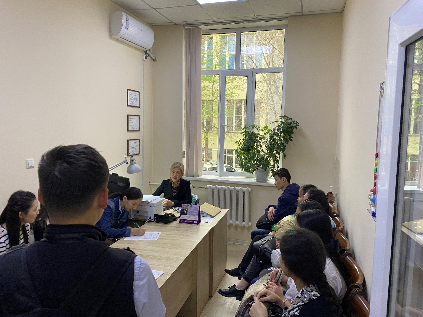 Жалпы медицина-1 мектебінің деканы Измайлова С.Х. 1 курс студенттерімен кезекті кезесуін бастады. Кездесуде оқу үрдісі, жатақханада тұру ережесі, стипендия және студенттердің қысқы және жазға каникул кезінде төленетін жол ақысы туралы қайталап айтып өтті. Адалдық кодексін бұзбау қажеттігінде тағыда атап өтті.