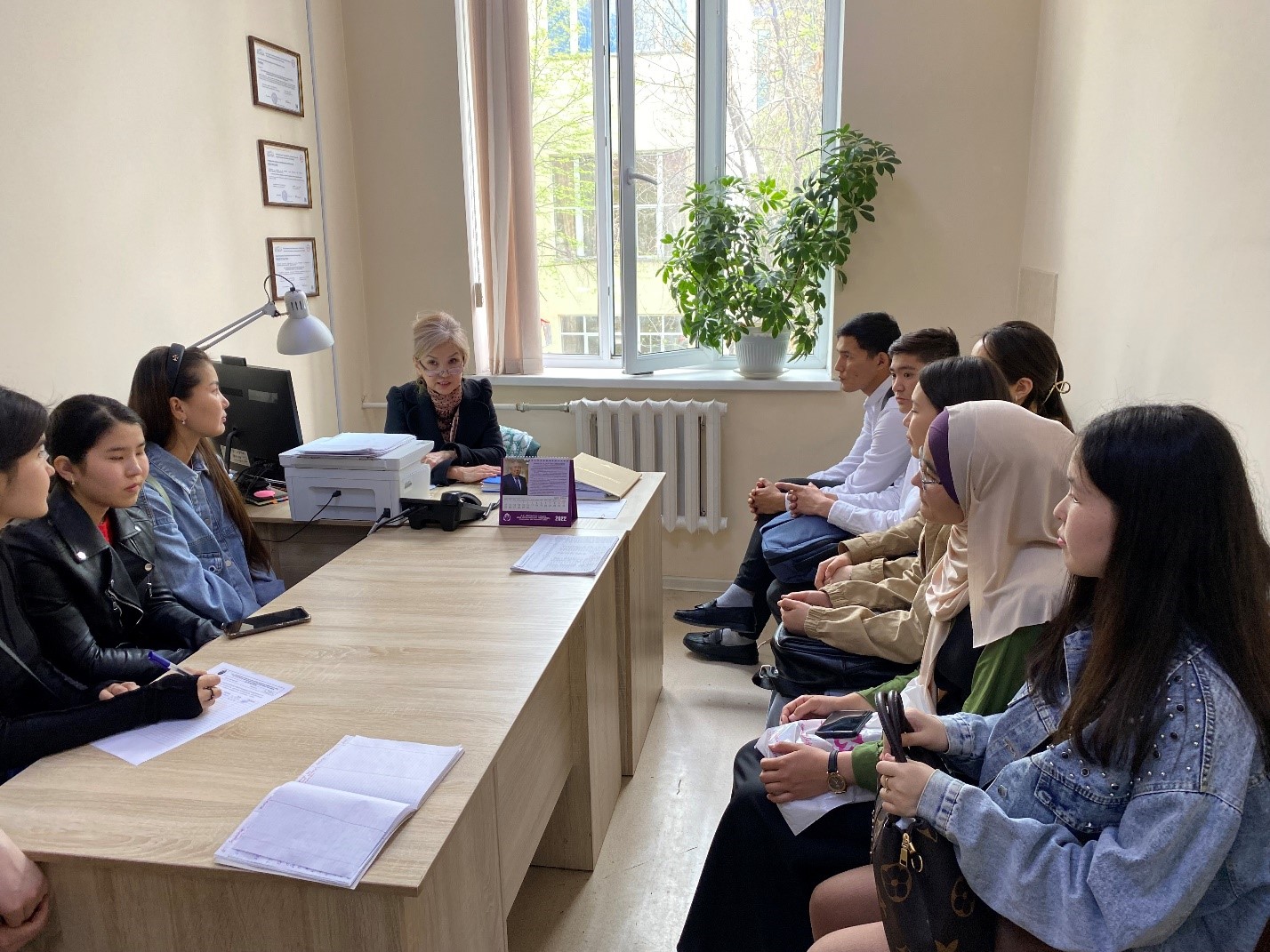Жалпы медицина-1 мектебінің деканы Измайлова С.Х. 1 курс студенттерімен кезекті кезесуін бастады. Кездесуде оқу үрдісі, жатақханада тұру ережесі, стипендия және студенттердің қысқы және жазға каникул кезінде төленетін жол ақысы туралы қайталап айтып өтті. Адалдық кодексін бұзбау қажеттігінде тағыда атап өтті.