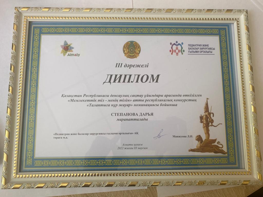 03.06.2022 жылы әл-Фараби атындағы ҚазҰУ кітапханасында «Қазақстан Республикасындағы тіл саясатын жүзеге асырудың 2020-2025 жылдарға арналған мемлекеттік бағдарламасын денсаулық сақтау жүйесінде іске асыру жөніндегі 2020-2025 жылдарға арналған іс-шаралар жоспарының» 10-тармағын орындау мақсатында ҚР Денсаулық сақтау министрлігінің «Педиатрия және балалар хирургиясы ғылыми орталығының» ұйымдастыруымен Денсаулық сақтау жүйесі қызметкерлерінің арасында ұйымдастырылған «Мемлекеттік тіл – менің тілім» атты республикалық конкурстың жеңімпаздарын марапаттау рәсімі өтті.