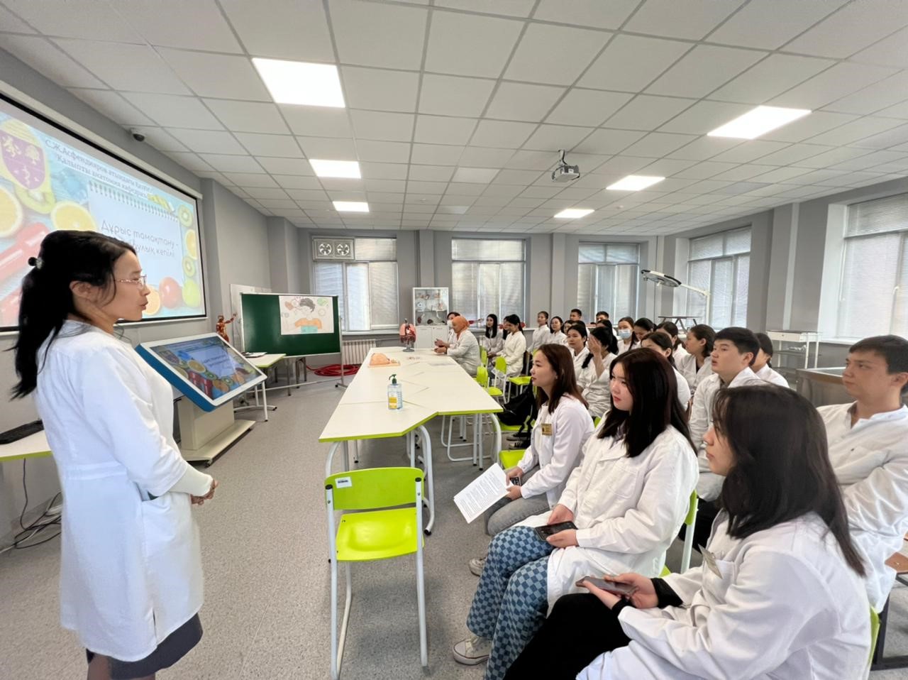 2022 жылы сәуір айының 7 күні 119 аудиторияда сағат 9.00 да Дүниежүзілік денсаулық күніне орай «Денсаулық – зор байлық» тақырыбында, 1 курс П21-003-2 тобының және 1 курс ҚДС 21-002-1; ҚДС 21-001-2 топтарының студенттерінің қатысуымен дөңгелек стөл өткізілді. Ис шараның басында аға куратор Абиырова Назым Бейсеновна өз сөзімен бастап, іс шара туралы ақпараттар беріп, іс шараның мақсатымен таныстырды. Дөңгелек стөлге кафедра ПОҚ (Ахмад Н.С., Искакова Л.А., Абиырова Н.Б., Дармен Н.Ж., Курбаниязова С.С., Келимбетова Ж.Т.) қатысты. Ис шараның мақсаты: салауатты өмір салтын насихаттау, өмір сүру ұзақтығын арттыру, дұрыс тамақтануды насихаттау болып табылады. Дөңгелек стөлде дұрыс тамақтану, оразаның пайдасы тақырыптарында презентациялар таныстырылды, викториналық сұрақтар қойылды, денсаулыққа байланысты мақал мәтелдер айтылды, сонымен қатар денсаулық сақтау мекемелерінің жұмыстары туралы да ақпараттар берілді.