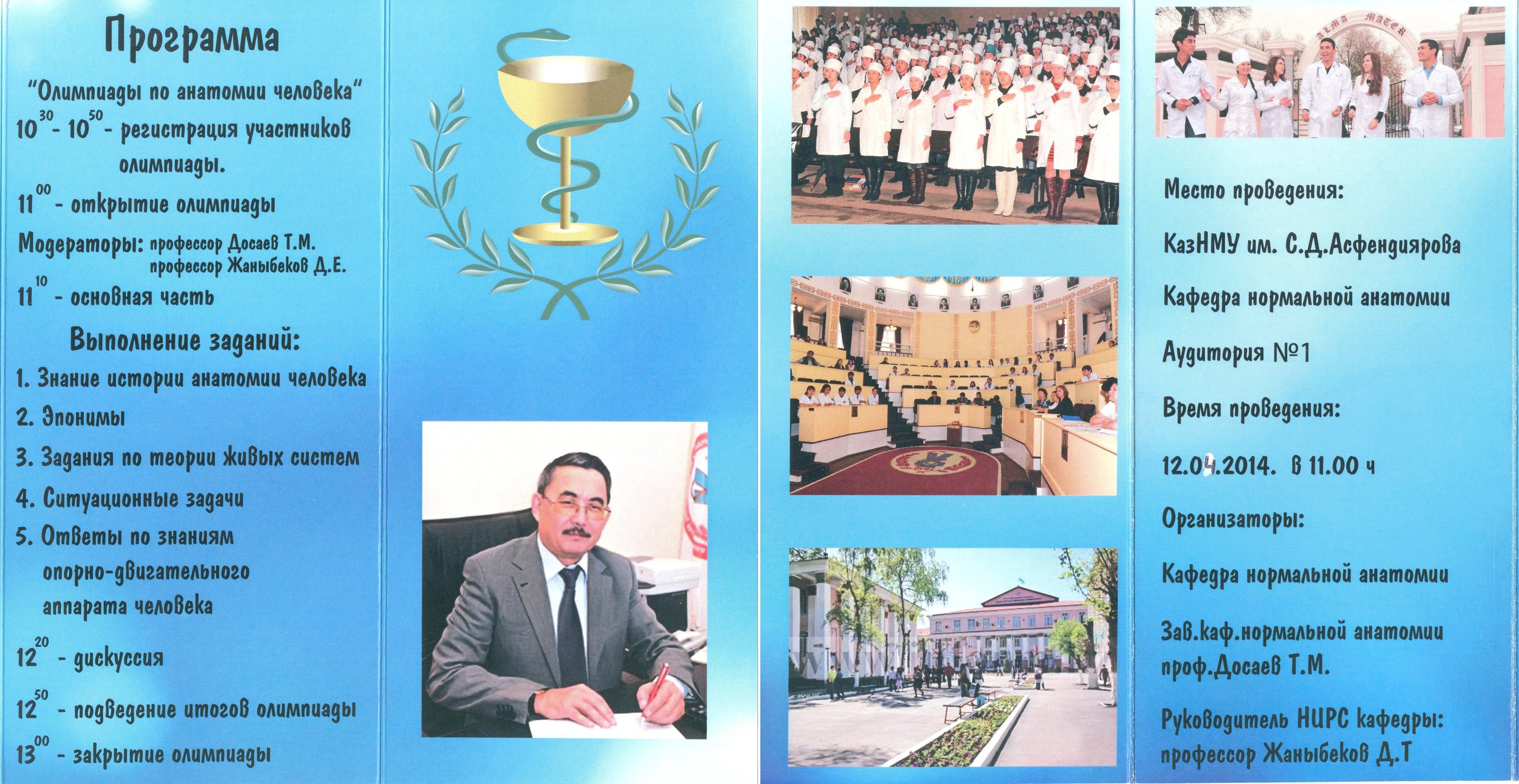 12 апреля 2014 года на кафедре нормальной анатомии прошла олимпиада по анатомии для студентов 1-го курса общемедицинского факультета на тему: ««Опорно-двигательный аппарат человека». До проведения Олимпиады студенты 1-го курса общемедицинского факультета были предварительно ознакомлены с планом проведения олимпиады.